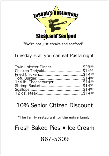 Spec Ads The attention grabber Because readers typically read from top to bottom, the top of the ad is prime real estate. Don't waste it with the business' logo, for example, despite many advertisers insistence that, if nothing else, they at least want to people to see and remember their name. After all, their name is meaningless to everyone but those people who already love them or hate them–both groups are not the best to target. Since the business you're making up the spec ad for most likely wants to attract the attention of people in the market for their product (including those who don't know them), a picture of the product or service has proven to be the strongest attention-getter. The name of the product or service (not the name of the business) is nearly equally effective if it can't be described graphically. Whether it's a graphic, words, or both, it should be instantly recognizable as the product the advertiser is selling and big enough that nobody glancing at the ad can miss it. This means it may need to be a quarter to a third of the ad. Take a look at the ad below. See how it doesn't attract people looking to go out for a seafood dinner? You'll find in many cases that the business' logo just doesn't properly communicate what the advertiser sells, resulting in dramatically fewer target customers seeing your ad.